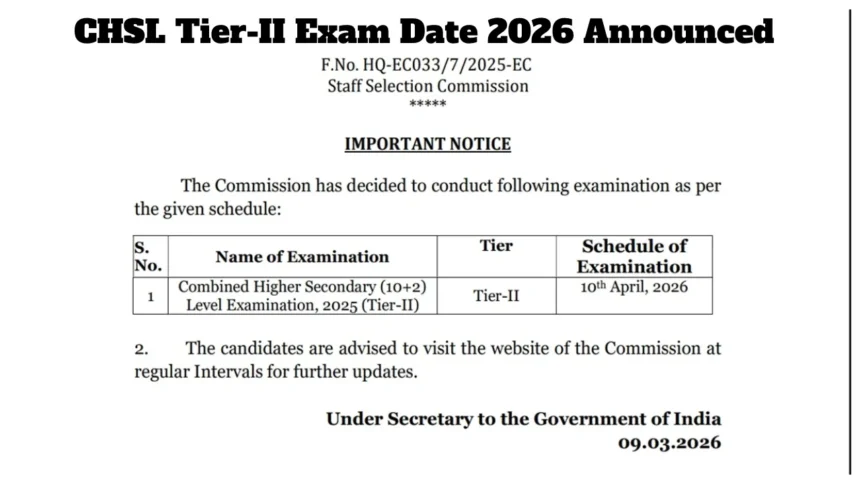 CHSL टियर-II परीक्षा तिथि 2026 घोषित: कर्मचारी चयन आयोग (SSC) ने CHSL टियर-II परीक्षा की तिथि की आधिकारिक घोषणा कर दी है। इस परीक्षा में शामिल होने के इच्छुक उम्मीदवार जल्द ही अपना एडमिट कार्ड डाउनलोड कर सकेंगे। SSC CHSL टियर-I परीक्षा सफलतापूर्वक उत्तीर्ण कर चुके उम्मीदवार CHSL टियर-II परीक्षा में बैठने के पात्र हैं।