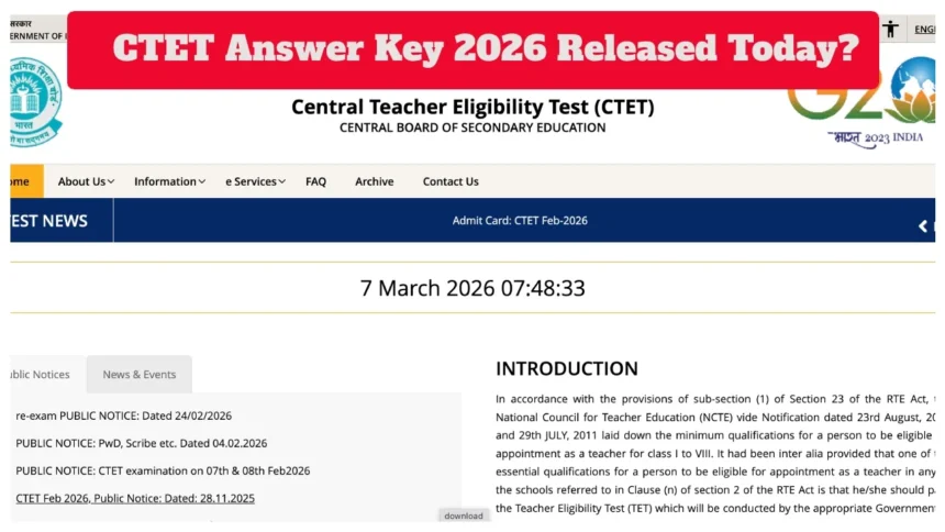 CBSE CTET आंसर की 2026: केंद्रीय माध्यमिक शिक्षा बोर्ड (CBSE) जल्द ही आंसर की जारी करने वाला है। CBSE अपनी आधिकारिक वेबसाइट ctet.nic.in पर केंद्रीय शिक्षक पात्रता परीक्षा (CTET) के पेपर 1 और पेपर 2 की आंसर की जारी करेगा। यह परीक्षा 7 और 8 फरवरी, 2026 को देशभर में आयोजित की गई थी। आंसर की जारी होने के बाद, उम्मीदवार अनंतिम आंसर की देख और डाउनलोड कर सकते हैं।