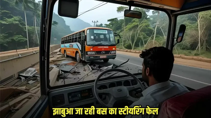 Jhabua News: शुक्रवार दोपहर रतलाम से झाबुआ की ओर जा रही एक यात्री बस का स्टीयरिंग अचानक फेल हो गया, लेकिन चालक की सूझबूझ से एक बड़ा हादसा होते-होते टल गया। यह घटना ग्राम छायन और बोरपाड़ा की सीमा के पास घटी, जहां बस अनियंत्रित होकर रोड से नीचे उतर गई।