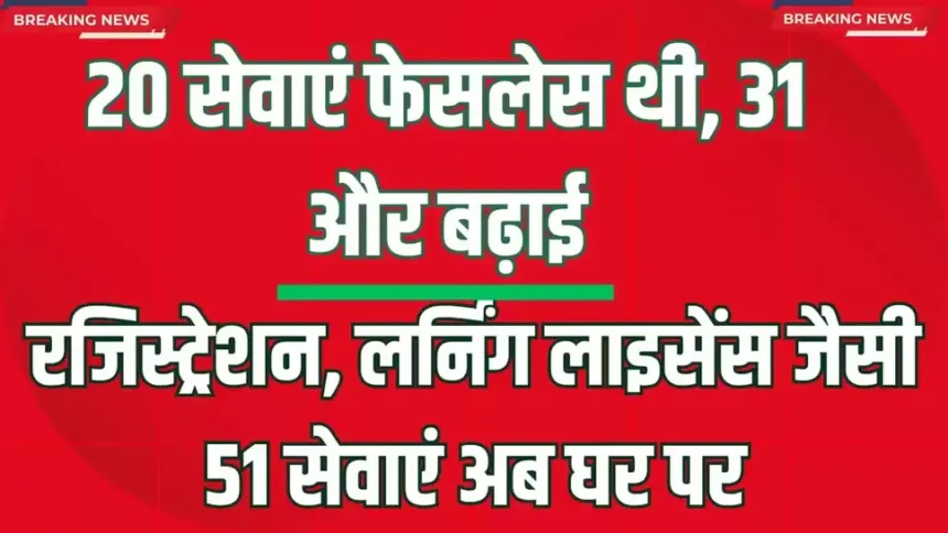 मध्य प्रदेश परिवहन विभाग ने अब 31 नई सेवाओं को भी फेसलेस कर दिया है। अब कुल 51 सेवाओं का लाभ लोग घर बैठे ऑनलाइन ही उठा सकेंगे। इनमें ड्राइविंग लाइसेंस का नवीनीकरण, लर्निंग लाइसेंस जारी करना, वाहन रजिस्ट्रेशन वाहन का ट्रांसफर जैसी अनेकों सेवाएं शामिल है।
