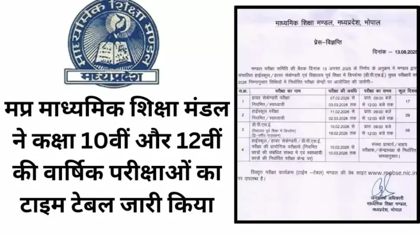 मप्र माध्यमिक शिक्षा मंडल ने कक्षा 10वीं और 12वीं की वार्षिक परीक्षाओं(varshik Pariksha) का टाइम टेबल(time table) जारी कर दिया है। 10वीं की परीक्षा 11 फरवरी से 2 मार्च तक 9 दिनों में, जबकि 12वीं की परीक्षा 7 फरवरी से 3 मार्च तक 17 दिनों में होगी। डीपीएसई (diploma ine pari school education)(डिप्लोमा इन प्री-स्कूल एजुकेशन) परीक्षा 10 से 19 फरवरी तक आयोजित होगी। 1 10वीं की परीक्षा हिंदी(10th Pariksha Hindi) से शुरू होगी और प्रमुख विषयों के बीच तीन दिन का गैप रहेगा। सभी परीक्षार्थियों को सुबह 8:30 बजे तक परीक्षा कक्ष में उपस्थित होना अनिवार्य होगा, जबकि 8:45 बजे के बाद प्रवेश नहीं मिलेगा। परीक्षा शुरू होने से 10 मिनट पहले उत्तर पुस्तिका और 5 मिनट पहले प्रश्नपत्र वितरित किए जाएंगे।