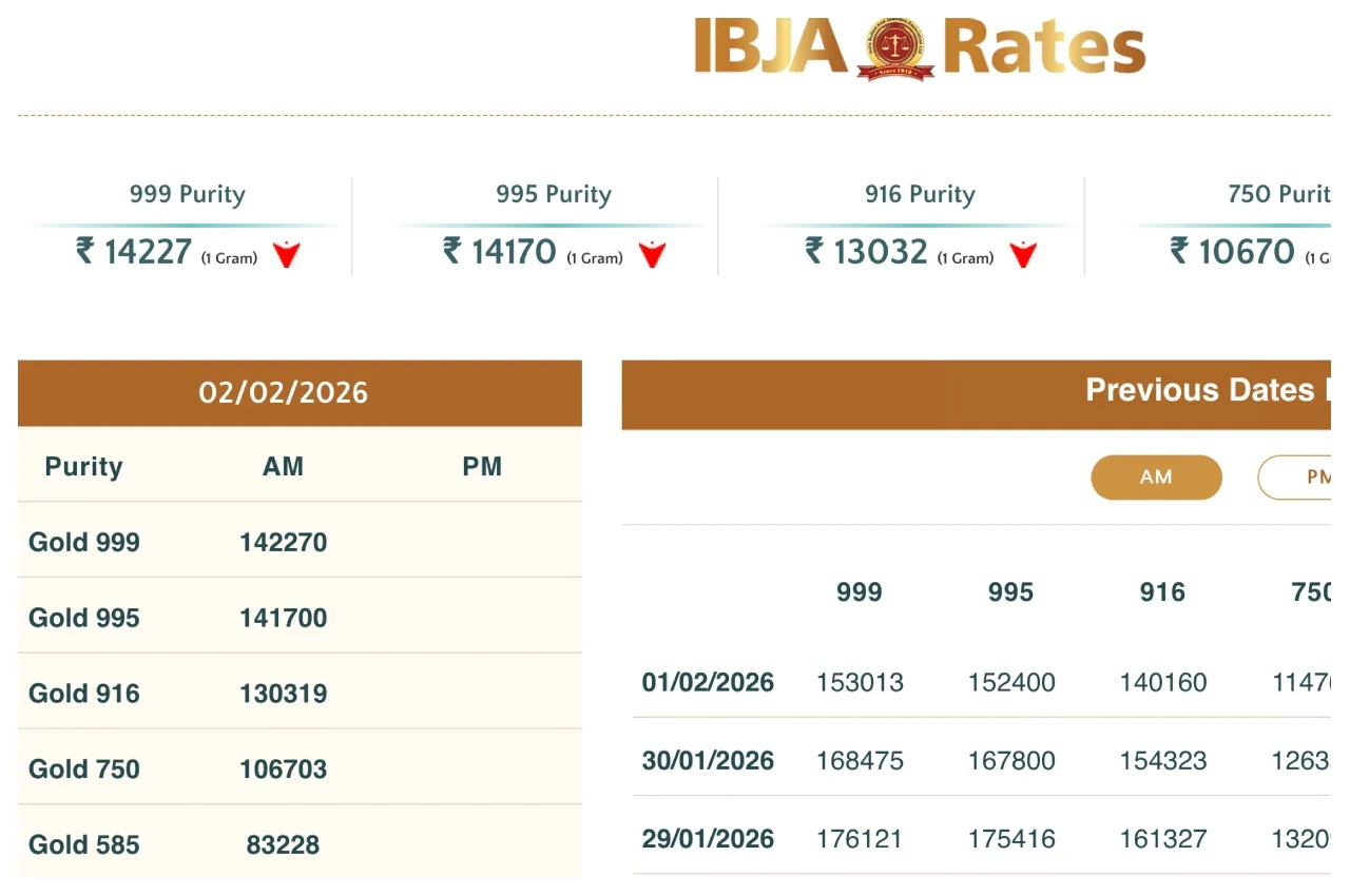 सोने-चांदी के भाव, 2 फरवरी – आज सोने की कीमत में ₹6,427 की गिरावट और चांदी की कीमत में ₹29255 की गिरावट दर्ज की गई। लाइव कीमतें देखें।