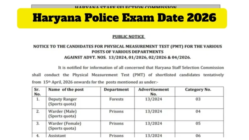 हरियाणा पुलिस परीक्षा तिथि 2026: हरियाणा पुलिस कांस्टेबल पदों के लिए आवेदन करने वाले छात्रों के लिए एक महत्वपूर्ण खबर आई है। हरियाणा कर्मचारी चयन आयोग (एचएसएससी) ने पुलिस कांस्टेबल पीएमटी/पीएसटी परीक्षा का कार्यक्रम जारी कर दिया है। पुलिस कांस्टेबल परीक्षा की तैयारी कर रहे उम्मीदवार जल्द ही पीएमटी/पीएसटी परीक्षा में शामिल हो सकेंगे। शारीरिक माप परीक्षण 15 अप्रैल, 2026 को निर्धारित है। इस परीक्षा के माध्यम से 5,500 उम्मीदवारों की भर्ती की जाएगी।