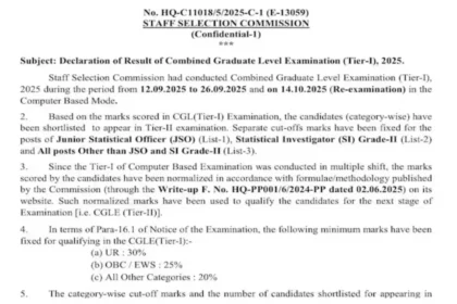 एसएससी सीजीएल टियर 1 रिजल्ट 2025 घोषित – जेएसओ और एसआई ग्रेड-II कट-ऑफ ssc.gov.in पर देखें