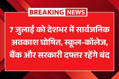 Public Holiday :7 जुलाई को देशभर में सार्वजनिक अवकाश घोषित, स्कूल-कॉलेज, बैंक और सरकारी दफ्तर रहेंगे बंद