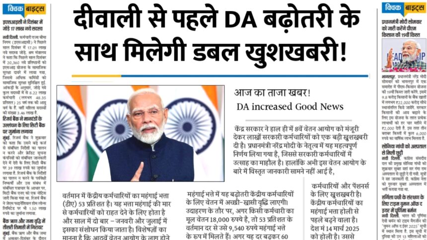DA Hike in government employees: केंद्र सरकार के करोड़ों कर्मचारियों और पेंशनभोगियों के लिए दिवाली से पहले एक बड़ी खुशखबरी आने वाली है। सूत्रों के अनुसार सरकार महंगाई भत्ते यानी डीए में तीन प्रतिशत की बढ़ोतरी करने की तैयारी में है। यह बढ़ोतरी त्योहारी सीजन से पहले घोषित की जा सकती है जो कर्मचारियों के लिए एक बड़ी राहत होगी। महंगाई के इस दौर में यह बढ़ोतरी सरकारी कर्मचारियों की क्रय शक्ति को बढ़ाने में मदद करेगी।