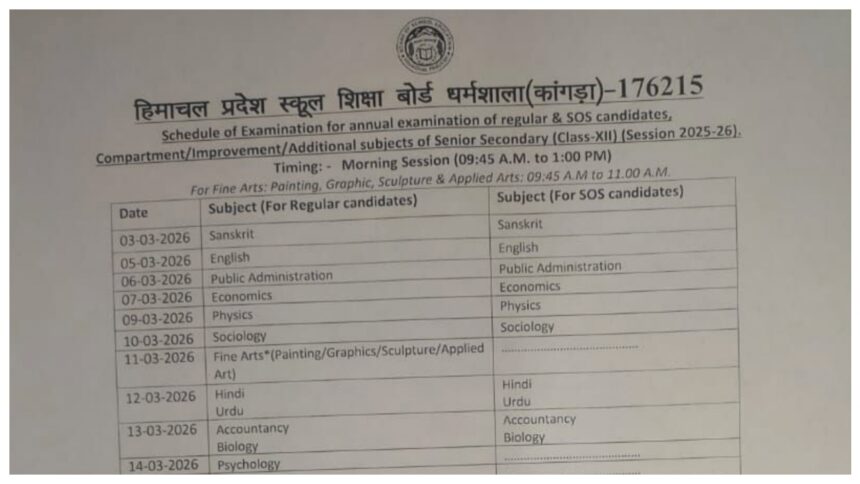 हिमाचल प्रदेश बोर्ड कक्षा 10वीं और 12वीं की बोर्ड परीक्षाएँ 3 मार्च, 2026 को आयोजित करेगा। कक्षा 10वीं का पहला पेपर अंग्रेजी और अंतिम पेपर सामाजिक विज्ञान का होगा। कक्षा 12वीं का पहला पेपर संस्कृत और अंतिम पेपर संगीत का होगा।