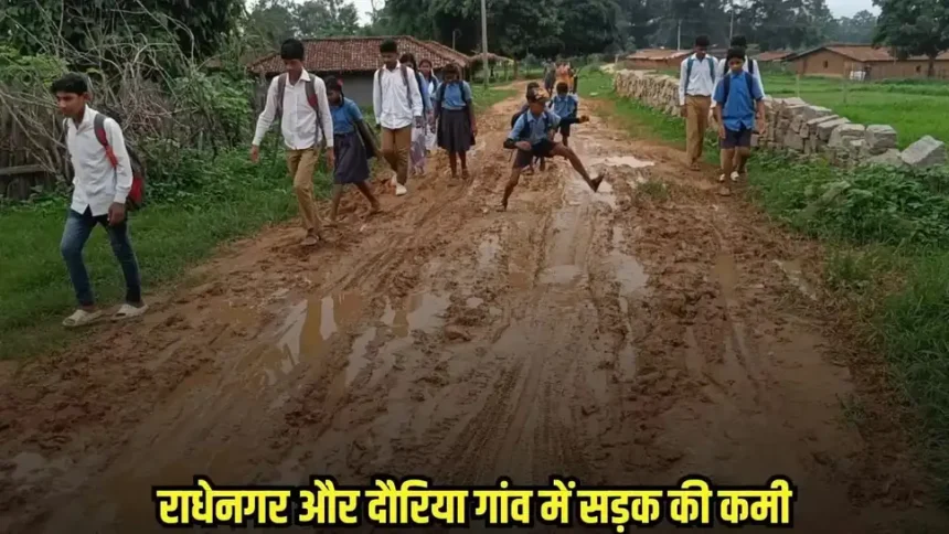 राधेनगर और दौरिया गांव में सड़क की कमी, कीचड़ से स्कूल जाते बच्चे