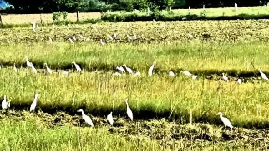 सफेद बगुले इन्हीं का शिकार करने के लिए किसानों के पीछे-पीछे खेतों में मंडराते रहते हैं। कई बार दर्जनों की संख्या में बगुले एक साथ खेत के ऊपर उड़ते और जमीन पर उतरते दिखाई देते हैं। यह दृश्य खेतों में जीवन चक्र और प्रकृति के संतुलन को भी दर्शाता है।