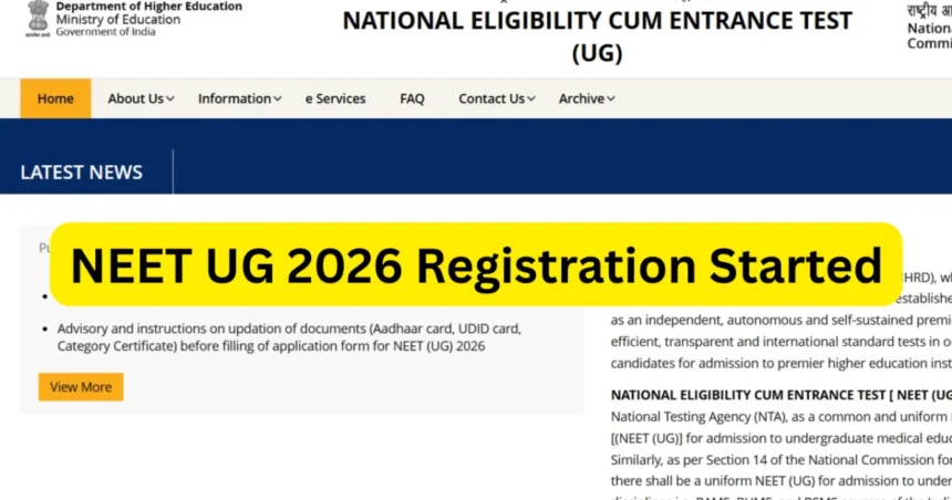 NEET UG 2026 पंजीकरण शुरू: राष्ट्रीय परीक्षण एजेंसी (NEET) ने भारत में स्नातक चिकित्सा पाठ्यक्रमों में प्रवेश के इच्छुक छात्रों के लिए NEET UG 2026 पंजीकरण शुरू कर दिया है। राष्ट्रीय चिकित्सा प्रवेश परीक्षा की प्रक्रिया उम्मीदवारों द्वारा पंजीकरण का पहला चरण पूरा करने के साथ ही शुरू हो जाती है। NEET आवेदन स्वीकार करने के कारण वर्तमान में आधिकारिक NEET पोर्टल ही एकमात्र ऑनलाइन पंजीकरण मंच है।