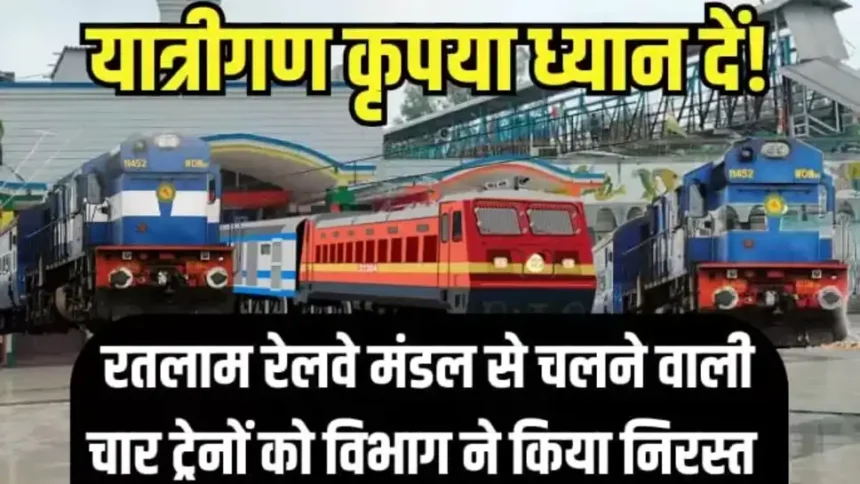 Ratlam Railway Mandal: रेलवे विभाग ने रतलाम रेलवे मंडल से चलने वाली चार ट्रेनें निरस्त करने की सूचना जारी की है। रेलवे विभाग से मिली जानकारी के अनुसार शनिवार को मंडल से होकर चलने वाली चार एक्सप्रेस ट्रेनों को रेलवे ने निरस्त कर दिया है।