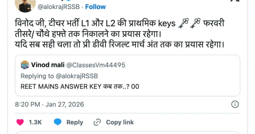 राजस्थान शिक्षक भर्ती मुख्य परीक्षा 2026 की उत्तर कुंजी जल्द जारी होगी: राजस्थान शिक्षक भर्ती मुख्य परीक्षा 17 से 20 जनवरी के बीच आयोजित की गई थी। परीक्षा में शामिल हुए उम्मीदवार अब अपने संभावित अंकों की जांच के लिए उत्तर कुंजी का बेसब्री से इंतजार कर रहे हैं। उत्तर कुंजी जारी होने के बाद आधिकारिक वेबसाइट rssb.rajasthan.gov.in या rajeduboard.rajasthan.gov.in पर डाउनलोड के लिए उपलब्ध होगी। उत्तर कुंजी डाउनलोड करने के लिए आपको अपना पंजीकरण नंबर और पासवर्ड दर्ज करना होगा। हाल ही में, RSSB के अध्यक्ष आलोक राज ने REET मुख्य परीक्षा की उत्तर कुंजी के संबंध में एक अपडेट दिया। उन्होंने सोशल मीडिया प्लेटफॉर्म X पर एक पोस्ट साझा करते हुए बताया कि राजस्थान शिक्षक भर्ती मुख्य परीक्षा के परिणाम कब तक जारी किए जा सकते हैं।