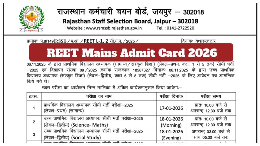 REET मेन्स एडमिट कार्ड 2026: REET परीक्षा में शामिल होने वाले उम्मीदवार बेसब्री से अपने एडमिट कार्ड का इंतजार कर रहे हैं। परीक्षा 17 से 20 जनवरी के बीच आयोजित की जाएगी। उम्मीदवार 12 जनवरी से अपना एडमिट कार्ड डाउनलोड कर सकते हैं। RSSB के अध्यक्ष आलोक राज के अनुसार, REET मेन्स एडमिट कार्ड 12 जनवरी को जारी किए जाएंगे। परीक्षा में शामिल होने वाले उम्मीदवार rssb.rajasthan.gov.in और rajeduboard.rajasthan.gov.in से अपना एडमिट कार्ड डाउनलोड कर सकते हैं। एडमिट कार्ड डाउनलोड करने के लिए उम्मीदवारों को अपना पंजीकरण नंबर और जन्मतिथि दर्ज करनी होगी। एडमिट कार्ड में परीक्षा की तिथि, समय और महत्वपूर्ण निर्देश शामिल होंगे। आइए जानते हैं कि उम्मीदवार अपना एडमिट कार्ड कैसे डाउनलोड कर सकते हैं: