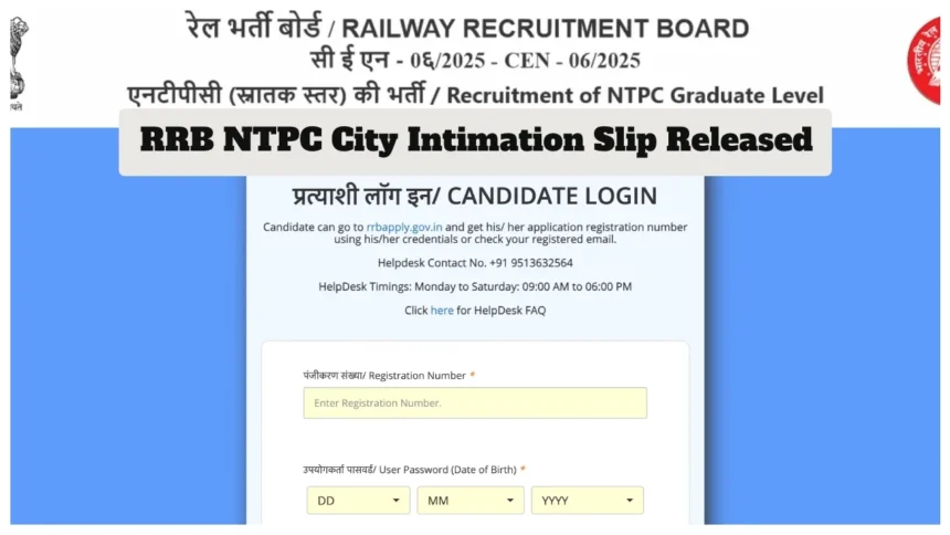 RRB NTPC स्नातक परीक्षा सिटी स्लिप लिंक
