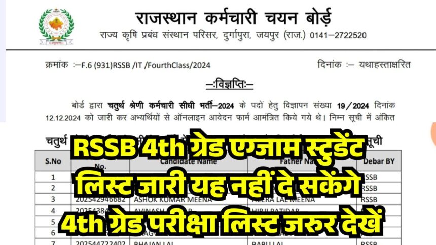 RSSB 4th Grade Dibar Students List 2025 राजस्थान फोर्थ ग्रेड एग्जाम 2025 जिसका आयोजन 19 से लेकर 21 सितंबर 2025 तक करवाया जाएगा इस परीक्षा के एडमिट कार्ड 12 सितंबर 2025 को जारी किए जाएंगे इसको लेकर ऑफिशल नोटिफिकेशन जारी कर दिया गया है इसके एग्जाम डेट में कोई बदलाव नहीं किया जाएगा और इस एग्जाम को लेकर एक बड़ी खबर सामने आ रही है जिसकी चर्चा यहां पर करने वाले हैं ।