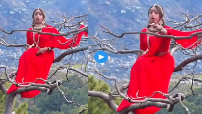 इस वीडियो में आप देख सकते है कि एक महिला पेड़ की सबसे ऊंची और पतली शाखा पर बैठकर खुद को पेड़ों की रानी बता रही है. इस वीडियो में महिला लाल साड़ी पहने हुए एक सूखे और बिना पत्तों वाले पेड़ की टहनी पर बैठी है. महिला के पीछे पहाड़ और दूर तक फैला शहर नजर आ रहा है.